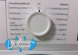 Elke machine wordt volledig doorgelicht. Bij veel modellen vervangen we de koolborstels standaard preventief, ook als ze nog niet versleten zijn. De pomp controleren we op speling en de printplaat op losse solderingen of zwakke plekken. Rubbers en kuip worden nagekeken op lekkage en de schokbrekers op stevigheid. We lezen AEG-, Bosch- en vergelijkbare machines uit via het diagnosesysteem om verborgen foutcodes te vinden. Bij Miele controleren we het aluminium trommelkruis nauwkeurig — als het ingescheurd is of zwakte vertoont, vervangen we dit door een stalen kruis voor maximale duurzaamheid en toekomstbestendigheid. Dit is slechts een deel van onze uitgebreide technische inspectie.