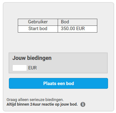 Om een bod te kunnen plaatsen dien je je aan te melden (registreren). Dit is geheel gratis en natuurlijk zonder bijkomende kosten! Na het plaatsen van een bod krijg je binnen 24 uur een reactie. Let op! Bij het plaatsen van een bestelling hoef je je niet aan te melden/registreren.